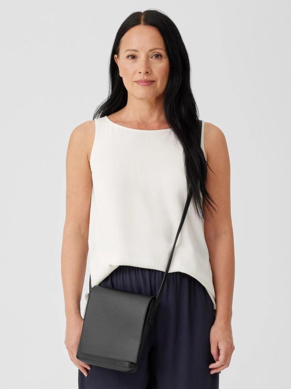 Simple yet practical. A square crossbody with a front flap and narrow shoulder strap. In smooth Italian leather.