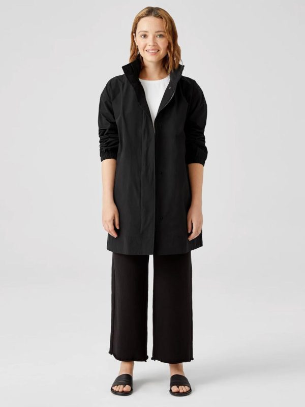 A stand collar coat with subtle sheen. Designed with a hidden hood inside thecollar and elasticized cuffs, in a cotton nylon weave we count on.