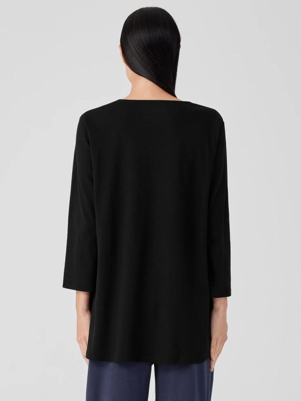 - U-neck, 3/4 sleeves, stepped hem with 3 1/2-inch side slits.