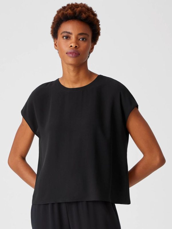 Timeless and versatile. An easy crew neck top with cap sleeves and a keyhole back closure. In our signature Silk Georgette Crepe,perfect day or night.