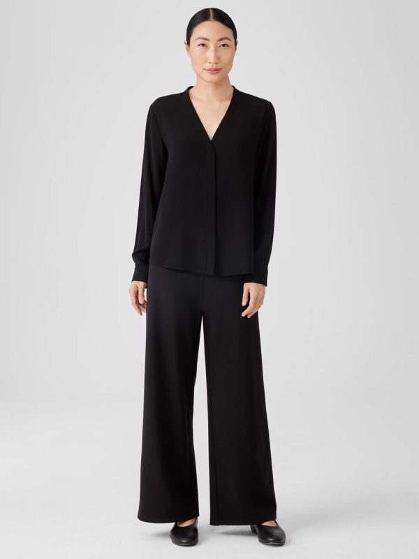 An elegant V-neck top with a hidden front placket and curved shirttail hem. In our signature Silk Georgette Crepe, perfect day ornight.